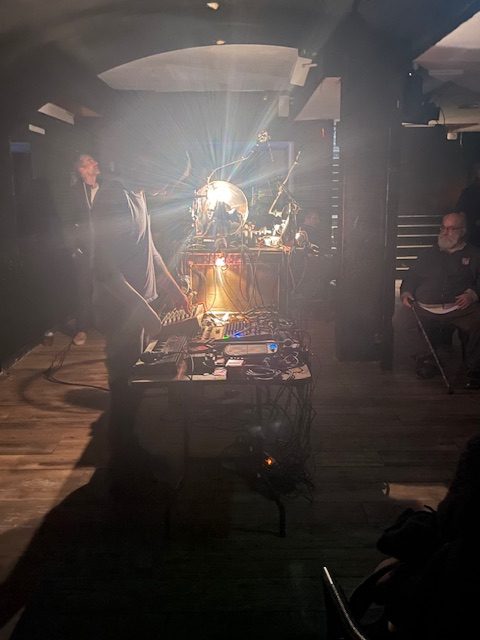 Plongée dans une véritable ambiance à la Tim Burton, Terry Gillian ou encore la Cie Titanos c’est l’impression que j’ai chaque fois que je vois 12V5 alias Emmanuel Morvan et sa machinerie sur laquelle il joue et interagissent divers éléments visuels. Ce soir c’est la 2ème fois que je le vois et j’ai la même impression que la 1ère. Une machinerie complexe, brinquebalante, fascinante tant au point de vue musicale que visuelle. Une improvisation qui va durer une petite heure entre mélancolie, tristesse et voyage intérieur. Un trip singulier mené par un artiste chevronné qui fabrique et maîtrise tout son nécessaire-à-jouer. Impressionnant, bluffant à voir et à écouter ce 12V5. Deuxième fois que je discute avec lui après son expérimentation sonore, un mec ouvert, gentil et très abordable. A voir pour apprécier et comprendre ce que je raconte.