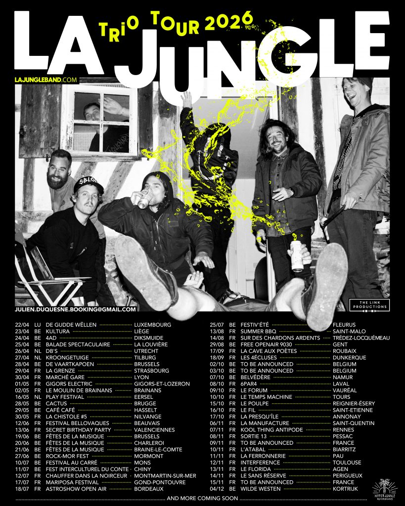 Plus de dix ans que je suis La Jungle en concert et sur disques (bien sûr), plus de dix ans que La Jungle me surprend encore et encore. Sixième fois que je les vois et ce soir c’est en mode spécial rouleau compresseur. Je m’explique dans l’ordre des choses, à commencer par David Temprano alias Landrose ce batteur doué techniquement et musicalement parlant qui vient survitaminé La Jungle ce duo montois hors-norme et que j’ai vu l’année dernière, voir mon article si vous avez deux minutes. Je découvre ce super lieu tout d’abord, un petit club de 150 places qui sera sold out ce soir. Il fait une chaleur à crever, heureusement il y a des ventilateurs qui font le taf quand la chaleur ce fait trop ressentir. Ce soir c’est la 1ère date de cette tournée du Trio Tour 2026, une date que j’essaye de choper depuis un petit bout de temps déjà. Ils seront le samedi 30 mai 2026 au Gueulard+ à Nilvange (57) pour celles et ceux qui n’ont pas pu rentrer ce soir. Un conseil, ne les loupez sous aucun prétexte c’est une vraie tuerie. La Jungle en plat direct, génial : pas d’entrée, pas de fromage, pas de dessert. Un plat divin avec une synchronisation parfaite des deux drummers que sont Roxie & Da pour les intimes qui vont foutre le dawa d’entrée tandis que Jim (guitare & basse) se lâchera comme d’habitude avec ses loops ravageurs sur lesquels il joue du gros son qui déchire la tête, sans oublier les jambes évidemment. Au bout de trois morceaux c’est parti pour une transe noise électro de dingues. Le club est au taquet et ce, jusqu’à la fin du concert. Super public, super groupe, super ambiance. Une fois de plus La Jungle m’a ouvert en deux et pas que moi d’ailleurs. Tout le monde était à fond. Génial !!! Un concert de oufs pour les oufs, putain que c’était trop trop bien. Je suis sorti archi trempé. La Jungle ne te laisse jamais au milieu du gué, ils te chopent là où ils veulent et te déposent là où ils veulent. Quand tu penses que ça va se terminer ou redescendre c’est justement là où ils accélèrent et t’envoient là où les choses se passent, c’est-à-dire haut, très très haut, higher and higher et toujours dans l’ordre des choses je me suis empressé à la fin du concert d’aller acheter leur dernière bombe sorti ce mois-ci « an order of things » à leur merch. Un disque génial où j’ai pu retrouver l’ambiance de leur live intense sans le public évidemment mais un disque riche et puissant avec des arrangements et des compositions dont ils ont le secret. Alors oui, oui et oui La Jungle est sur la route et n’essayez même pas de vous foutre en travers de leur route, vous allez vous faire écraser, vous êtes prévenu.es !!!