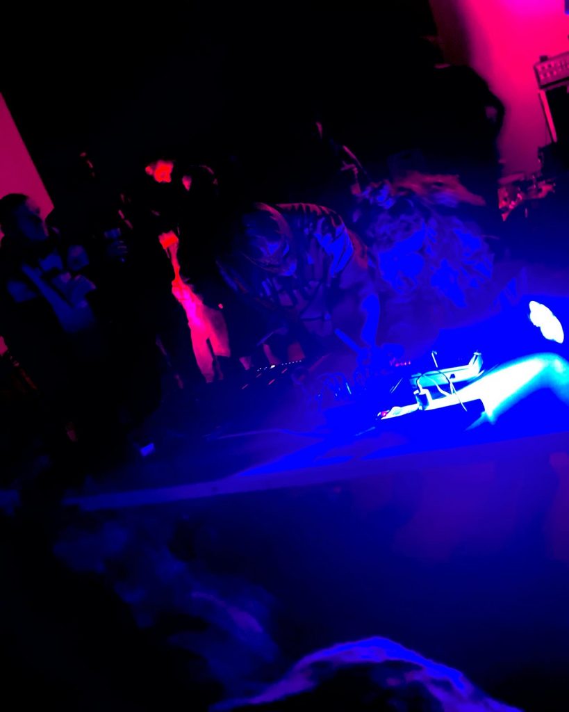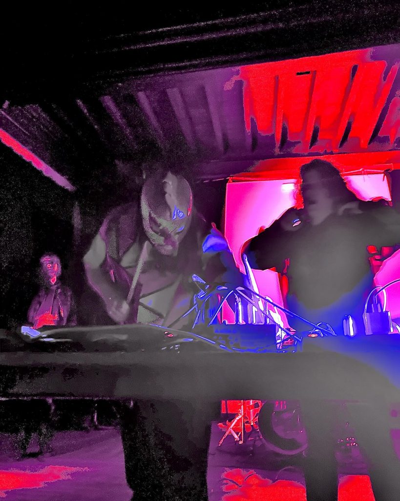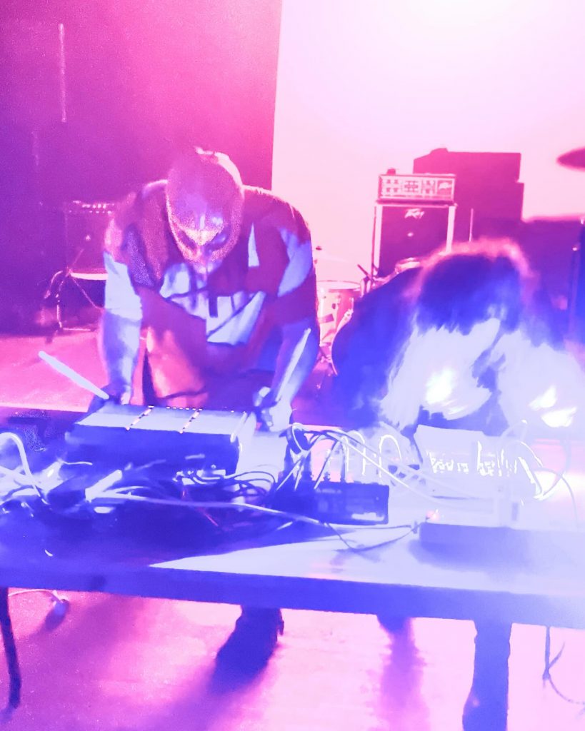 Dina (vox- synths) + Anatole (electronics drums) vont nous asséner un set digital hardcore des plus intéressants, dans les plus pures règles de l’art. Dès la première note le ton est donné, la première bombe lâchée, les premiers hurlements scandés. Dina s’en donne à « core-joie ». Un déferlement de beats intempestifs vient tranché net avec le set de NA-AN (très bon aussi mais dans un tout autre style). Pas de break entre les deux groupes d’où un effet maximum, on passe d’un « maghreb en mode krautrock » à un bombardement de beats sauvages, brutaux, urbains, ultra tendus. Un acharnement, une volonté de refléter musicalement ce qui se passe en Ukraine (Dina est ukrainienne) en mode Atari Teenage Riot, Alec Empire, Ambassador 21 ou encore Melt Banana. Quant à Anatole le nancéien intense, excessif caché derrière son masque de catcheur mexicain n’a fait qu’empirer les choses en s’acharnant sur son drumpad. Une avalanche de kicks, de cris, de hurlements me parlera direct. Fans des groupes précités je me suis immédiatement mobilisé en mode « arrachage de têtes ». Un set que j’ai adoré de par sa puissance, son engagement extrême, sa crédibilité. Je me suis hyper bien éclaté comme pas mal de gens d’ailleurs. J’espère que Wrong Chicken passera au Puissance Blaaaast 2026, en attendant je m’écoute leurs lives à Istanbul, à Berlin sur leur bandcamp. Voilà c’était donc Wrong Chicken, « le mariage de la grâce et du bruit » comme indiqué très justement sur le flyer RPT !!!